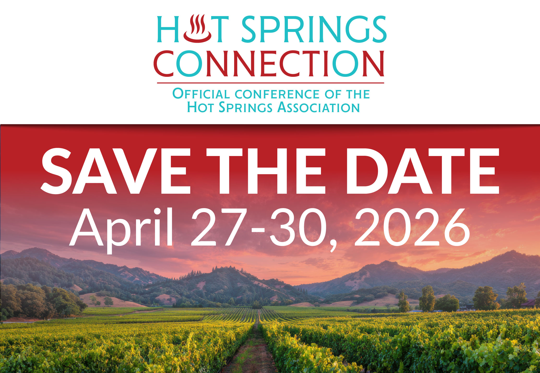 This year's Hot Springs Connection Conference will be held in Calistoga, California on April 27-30, 2026.